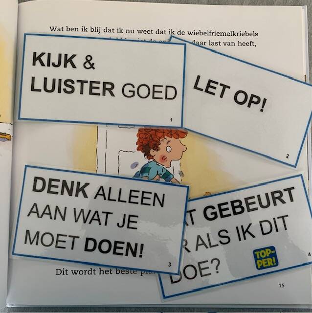 Ter ondersteuning van het verhaal, maar ook om in de groep te gebruiken, heb ik kaartjes gemaakt. Deze zijn te vergelijken met de ‘Stop, Denk en Doe’- kaartjes. Deze vind je in onderstaand bestand.