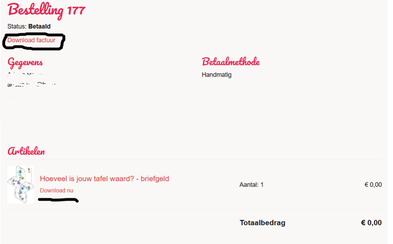 In dit venster dat nu geopend is, kun je de factuur downloaden, maar ook het product dat je gekocht hebt.
