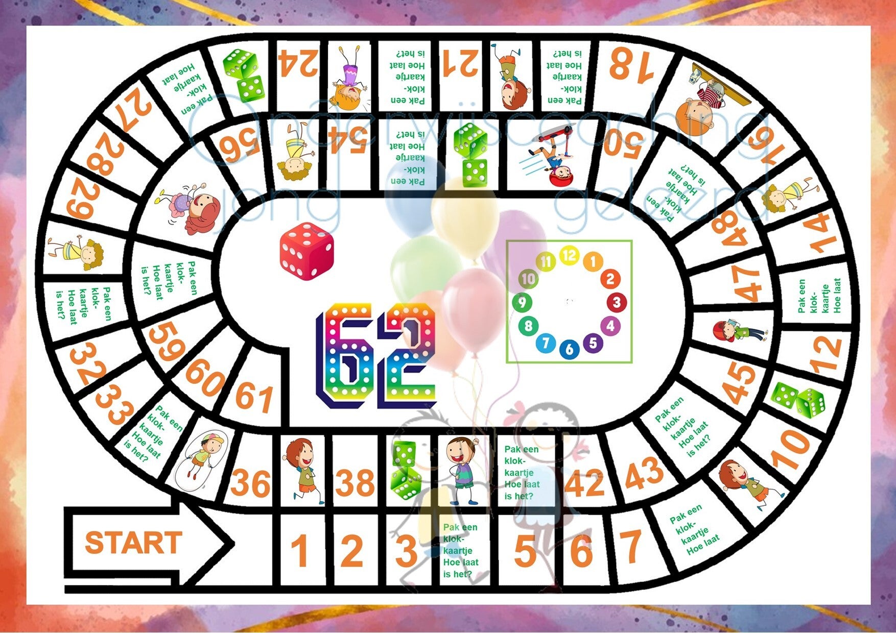 Met dit ganzenbord worden de hele en halve uren geoefend, de kwartieren en de klokken met 5 voor (half) en over (half).