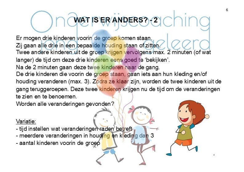 Bewegend en spelend leren door de verschillende spellen; kinderen leren en onthouden beter als ze tussen de lessen door even wat anders kunnen en mogen doen. Lessen op speelse wijze gegeven, worden beter onthouden.