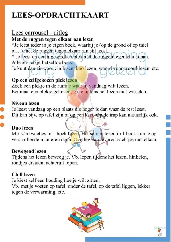Naast de leesopdrachtkaart, ontvang je ook de carrousel en de uitgebreide uitleg hierbij.