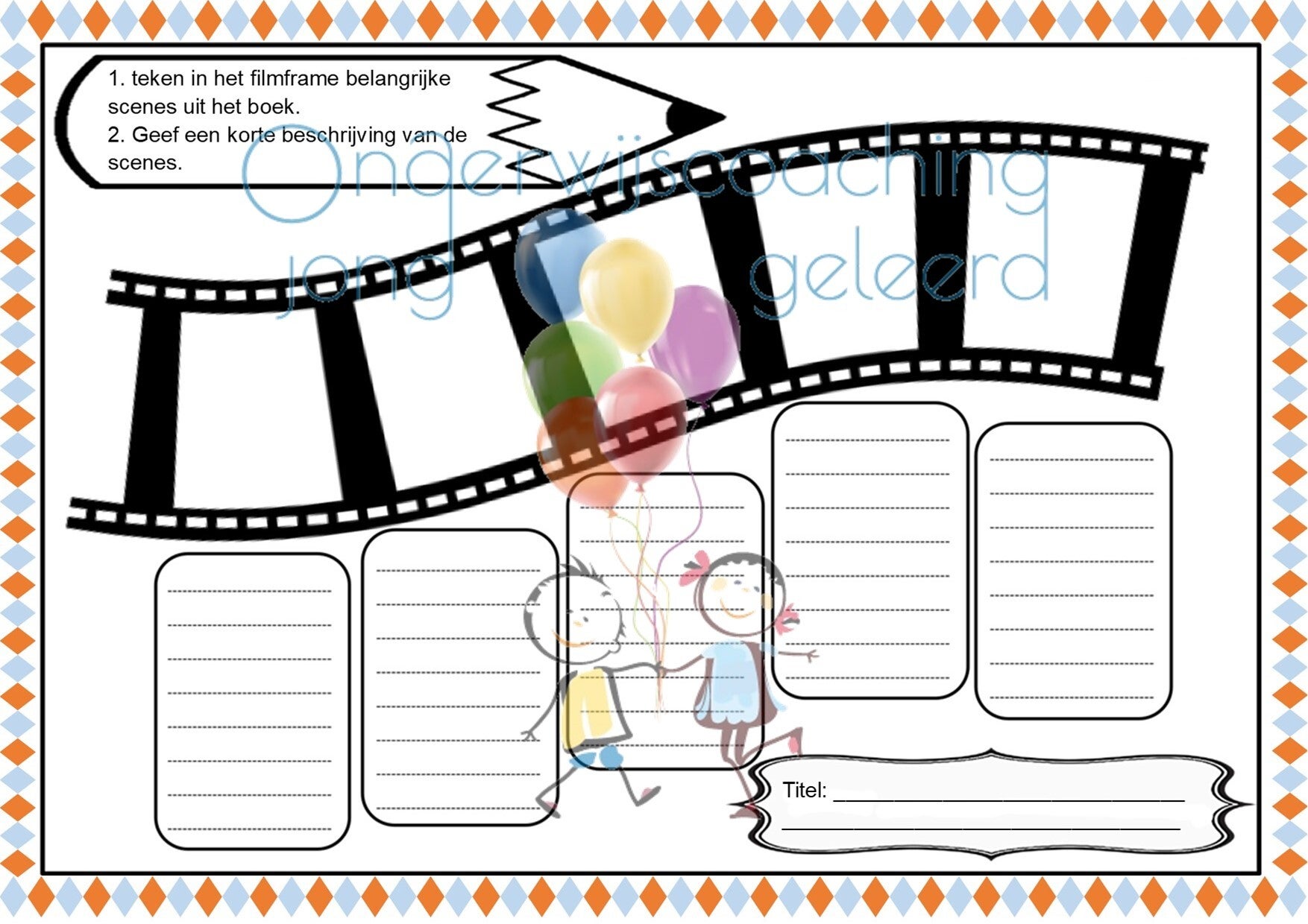 Bij deze leesopdrachtkaart ontvang je een A3 formaat werkblad om hierop het filmscript van het boek te bewerken.Ook ontvang je een a3 formaat werkblad met hierop een bioscoop scherm. Hierop kun je een scene uit het boek tekenen.