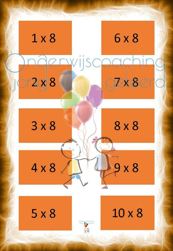 - oranje tafelkaartjes met de tafels van 1 t/m 10