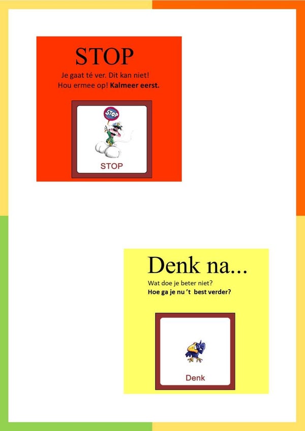 Deze Stop, Denk en Doe-kaarten evt i.c.m. het stoplicht kunnen helpend zijn voor kinderen om uit hun emotie te komen. Uit de emotie en een andere keuze maken.