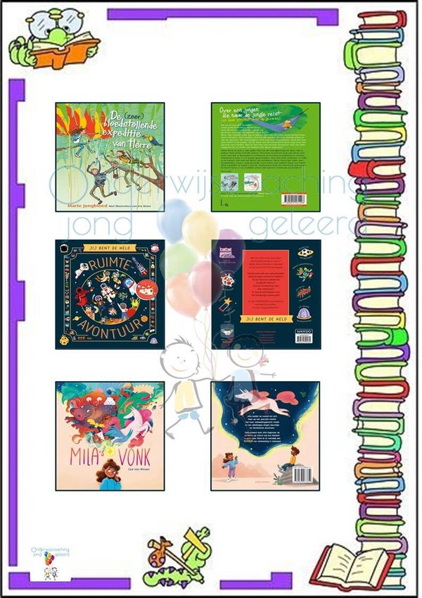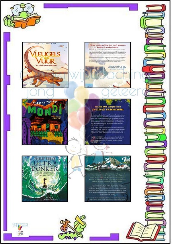 * als leespromotie: door alle voorkanten (met evt. achterkanten erbij) op te hangen/ op een groot vel op te plakken, zien kinderen in één oogopslag welke spannende en avontuurlijke boeken er allemaal zijn.