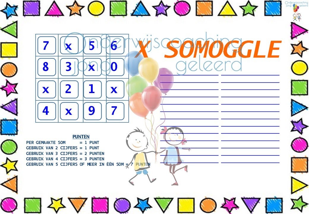 - 70 Somoggle kaarten (A4) met op iedere kaart meerdere malen de rekenkundige bewerking van vermenigvuldigen.