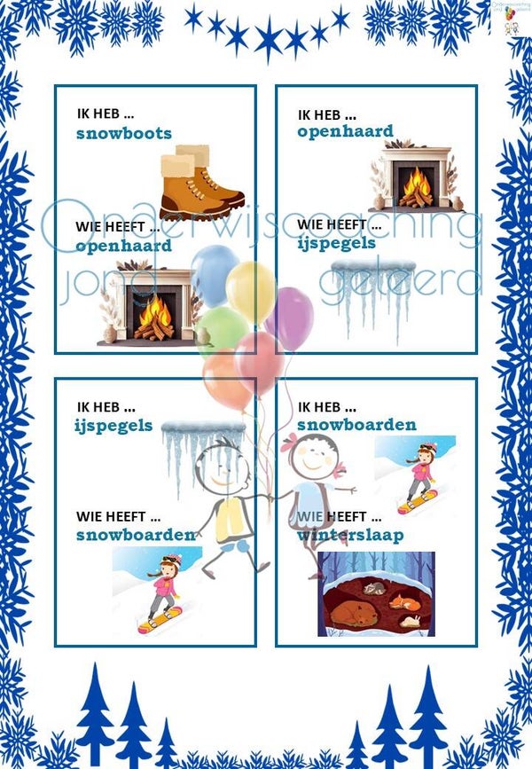 - 35 kaarten van 'Ik heb, wie heeft ...winter', waarbij er een duidelijke Start-kaart en een Einde-kaart aanwezig is.