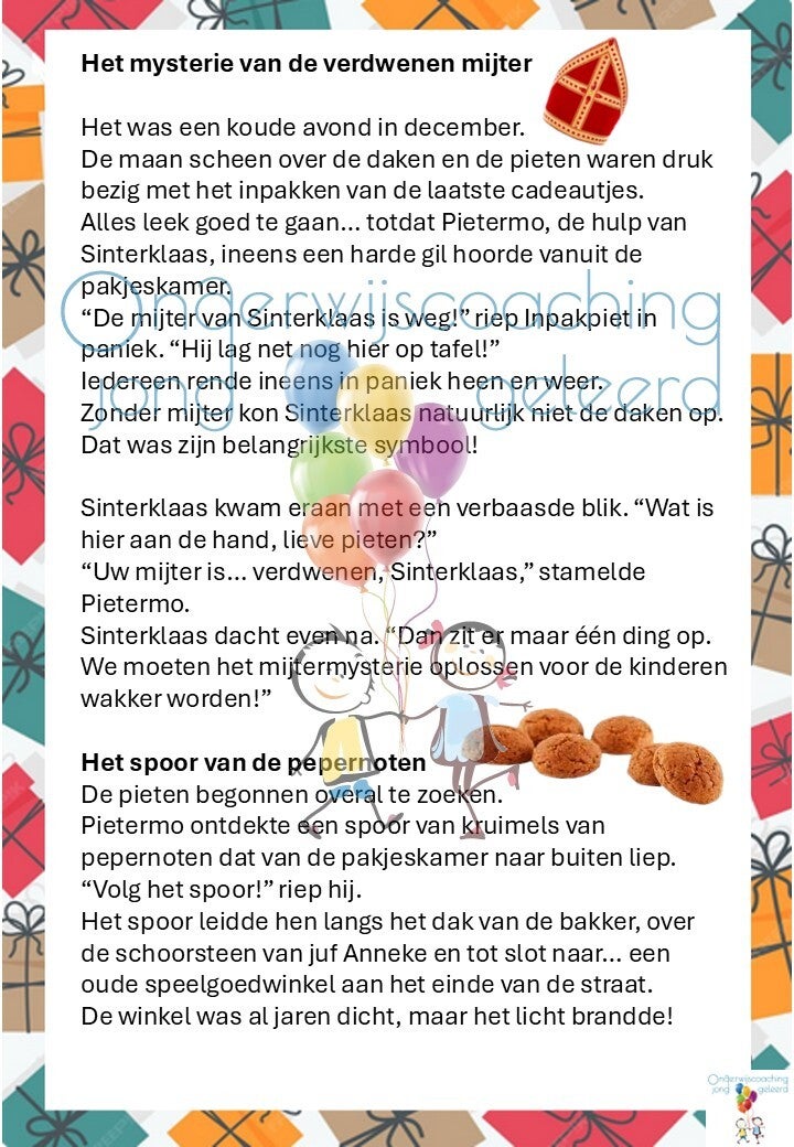 Er zijn twee Sinterklaasverhalen. Een verhaal voor de onder- en middenbouw en een wat spannender verhaal voor de bovenbouw.